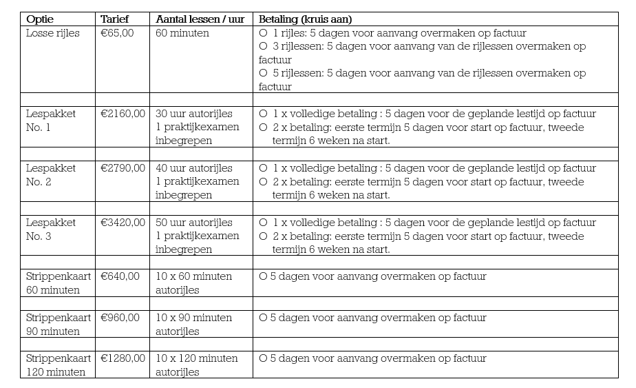 - Zonder tijdige betaling wordt en geen les uitgevoerd of gereserveerd.